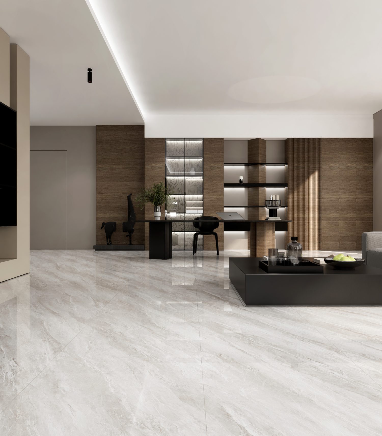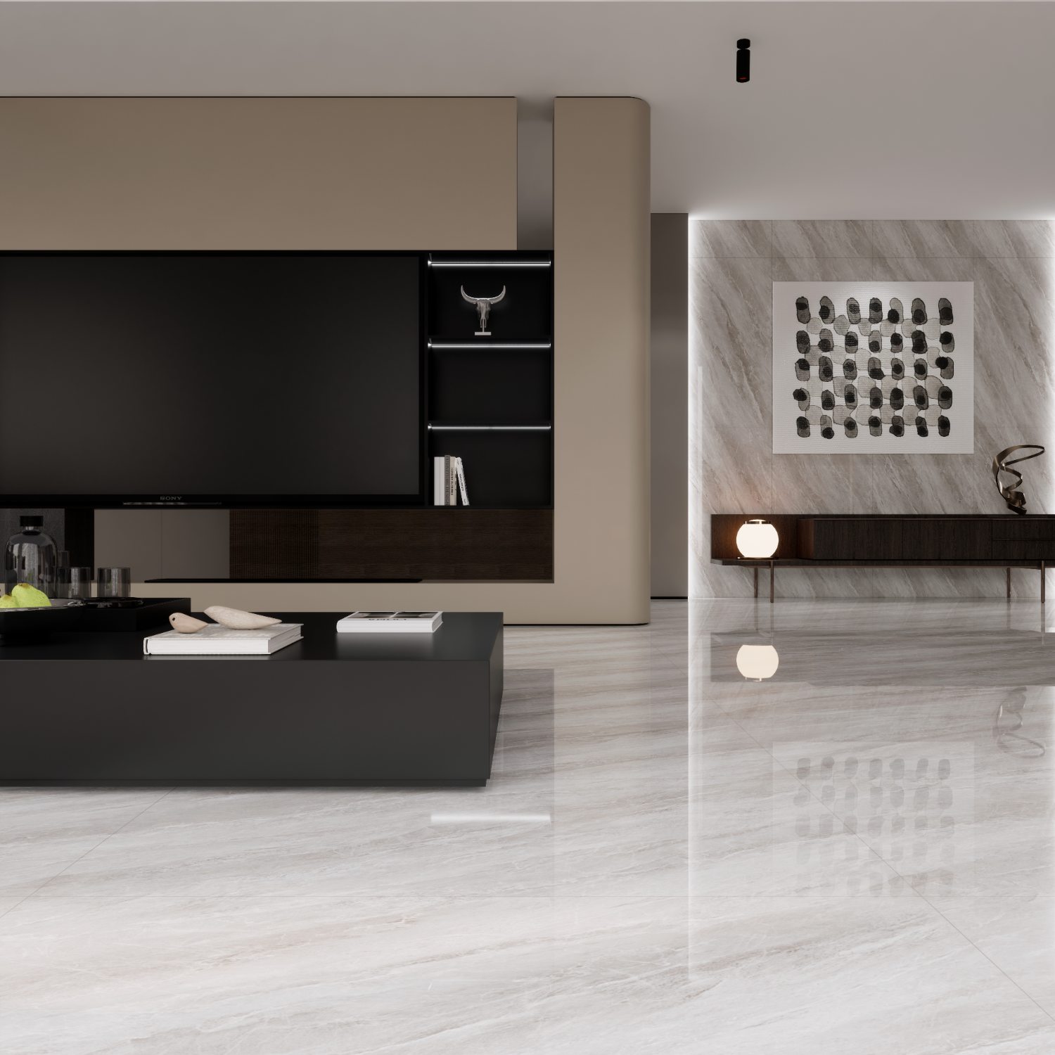 灵感源自天然砂石风化纹理,灰白基底上交织的流线纹路模拟星河轨迹。釉面融入结晶颗粒,在光线折射下呈现星砂闪烁效果,为现代极简或轻奢空间增添低调的星空韵律感。